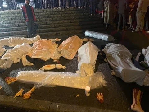 De "avrevne blodige lemmene" er skapt av Grethe B. og ble først gang brukt i markering mot Israels deltakelse i Grand Prix i 2024, på Nidarø. "Lemmene" er produsert på en avdeling på St. Olav som lager proteser. På Nidarø var de stablet på et grått teppe som illuderte ruiner i sønderskutte Gaza, oppe på toppen av en snøhaug. Så ble Grethe B invitert inn i utstillingen som Internasjonal Kvinneliga for Fred og Frihet (IKFF) i Trondheim arrangerte i forbindelse med "MiniFREDsfestivalen" vi hadde i en bunker under Kjøpmannsgata i 2024. Da var de plassert i en trillebåre, I markeringen mot Kongsbergsgruppen ble «de blodige lemmene» igjen tatt frem igjen og brukt. Spredd utover, i trappene de forventingsfulle studentene forserte og blant «likposene». ...som var godt synlige for de karriereglade studentene.